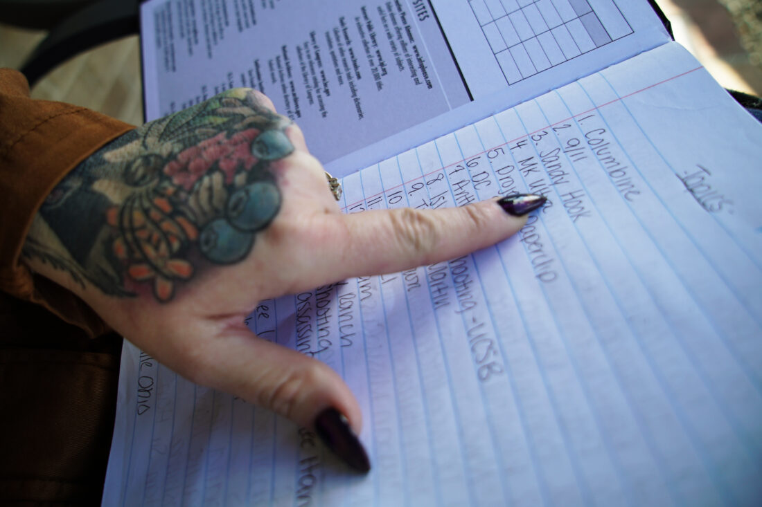- Melissa Sell points to entries in what her husband calls her “conspiracy journal” on the front porch of their home in Mount Holly Springs, Pa., on Tuesday, Oct. 31, 2023. When something piques her interest, the 34-year-old mother of one jots it down for further research. Sell said she began to lose trust in the government and the media shortly after the 2012 Sandy Hook school shooting in Newtown, Conn., which left 20 students and six teachers dead. Sell thought the shooter looked too small and weak to carry out such a bloody act. And the gut-wrenching interviews with stricken loved ones seemed too perfect, almost practiced. (AP Photo/Allen G. Breed)