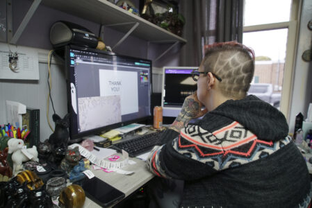 Melissa Sell uses her computer to work on inventory at her shop, Every Witch Way, in Mount Holly Springs, Pa., on Monday, Oct. 30, 2023. Sell said she believes the level of distrust is now so high that a civil war or some other kind of uprising could happen — but that it would be the government that starts it. (AP Photo/Allen G. Breed)