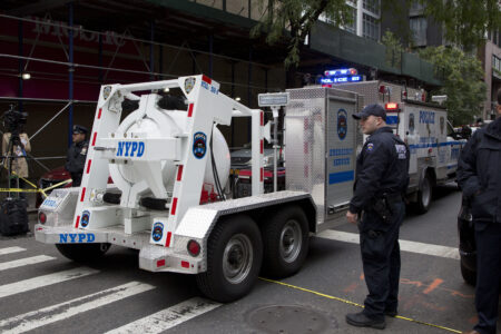 - FILE – A police truck tows a total containment vessel to a post office in midtown Manhattan to dispose of a suspicious package, Friday, Oct. 26, 2018, in New York. Two law enforcement officials say a package closely resembling parcels sent to critics of President Donald Trump were found at the postal facility in Manhattan. A committed conspiracy theorist from Florida mailed pipe bombs to CNN, Hillary Clinton and several other top Democrats; the man’s social media feed was littered with posts about child sacrifice and chemtrails — the debunked claim that airplane vapor clouds contain chemicals or biological agents being used to control the population. (AP Photo/Mark Lennihan, File)