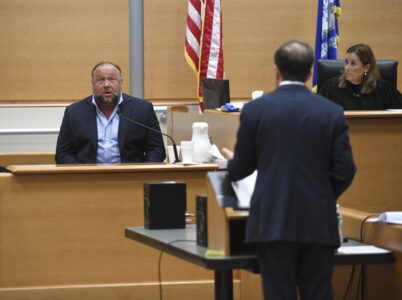 - FILE – Infowars founder Alex Jones, left, is questioned by plaintiff’s attorney Chris Mattei beside Judge Barbara Bellis, right, during testimony at the Sandy Hook defamation damages trial at Connecticut Superior Court in Waterbury, Conn. Thursday, Sept. 22, 2022. A $1.4 billion judgment was imposed against Jones for repeatedly calling the 2012 Newtown school shooting a hoax. (Tyler Sizemore/Hearst Connecticut Media via AP, Pool, File)