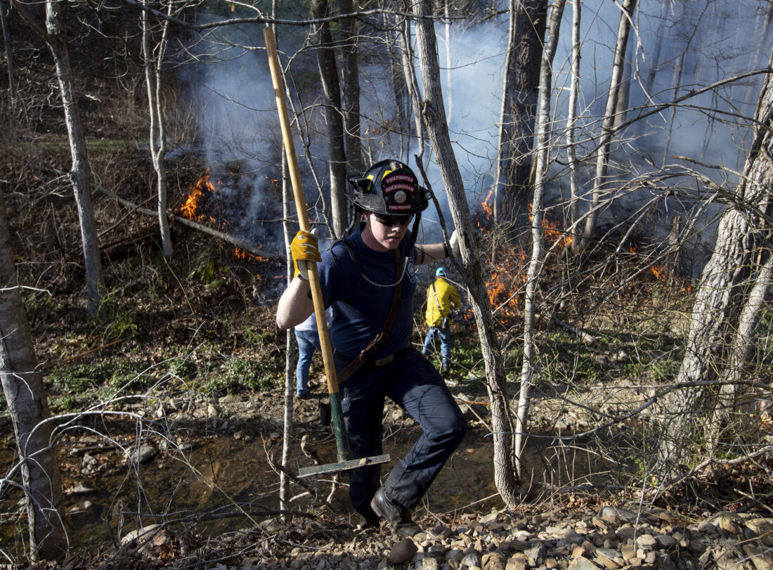 - A Rockingham County firefighter climbs out of Long Run along Peake Mountain Road during a wildfire, Wednesday, March 20, 2024, near Rawley Pike, Va. (Daniel Lin/Daily News-Record via AP)
