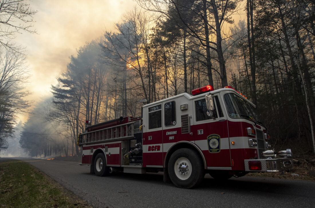 - A Rockingham County fire engine drives down Peake Mountain Road during a wildfire, Wednesday, March 20, 2024, near Rawley Springs, Va. (Daniel Lin/Daily News-Record via AP)