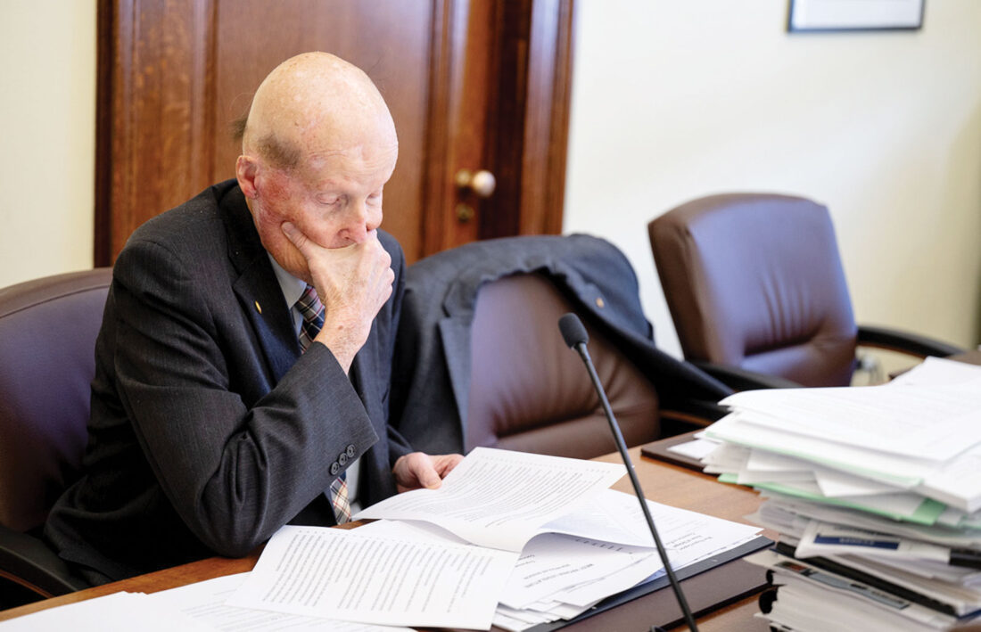 Del. Bill Anderson, R-Wood, reads through the House of Delegates’ version of the budget bill during a March 4 meeting of the House Finance Committee. (Photo Provided)