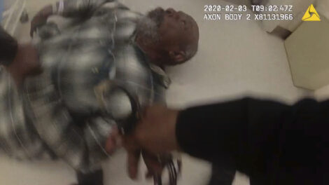 In this image from Birmingham Police Department body-camera video, Carl Grant lies on the floor at a hospital in Birmingham, Ala., on Feb. 3, 2020, as a police officer prepares to handcuff him. The Vietnam War veteran with dementia was taken to the hospital after trying to enter homes he thought were his, but were not. When he wouldn’t do as instructed at the hospital, an officer slammed him to the ground and damaged the spinal cord in Grant’s neck, paralyzing him. (Birmingham Police Department via AP)