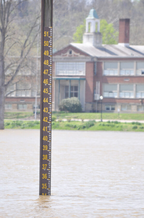 The river gauge at the end of Ohio Street has given Marietta residents a simple way to view the river levels for generations. The electronic gauge is across the Muskingum River near the former Harmar School. (Photo by Art Smith)