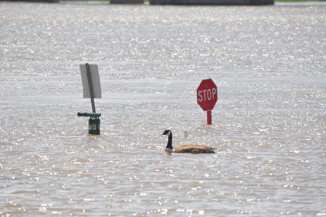 - A goose swims past signage that is normally along the River Trail at Fourth and Ohio streets Sunday. Several sections of the bike path remain under water. (Photo by Art Smith)