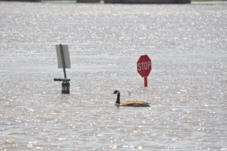 A goose swims past signage that is normally along the River Trail at Fourth and Ohio streets Sunday. Several sections of the bike path remain under water. (Photo by Art Smith)