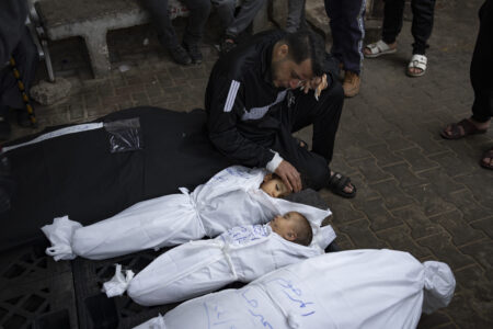- FILE – A man mourns over the bodies of his two daughters who were killed in the Israeli bombardment of the Gaza Strip, at a hospital morgue in Rafah, on April 4, 2024. An AP analysis of Gaza Health Ministry data finds the proportion of Palestinian women and children being killed in the Israel-Hamas war appears to have declined sharply. Israel faces heavy international criticism over unprecedented levels of civilian casualties in Gaza. (AP Photo/Fatima Shbair, File)