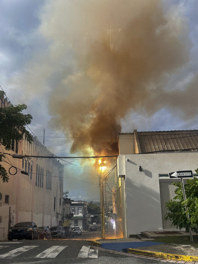 An electrical transformer explodes after the passage of Tropical Storm Ernesto in San Juan, Puerto Rico, Thursday, Aug. 15, 2024. (AP Photo/Alberto Bartolomei)
