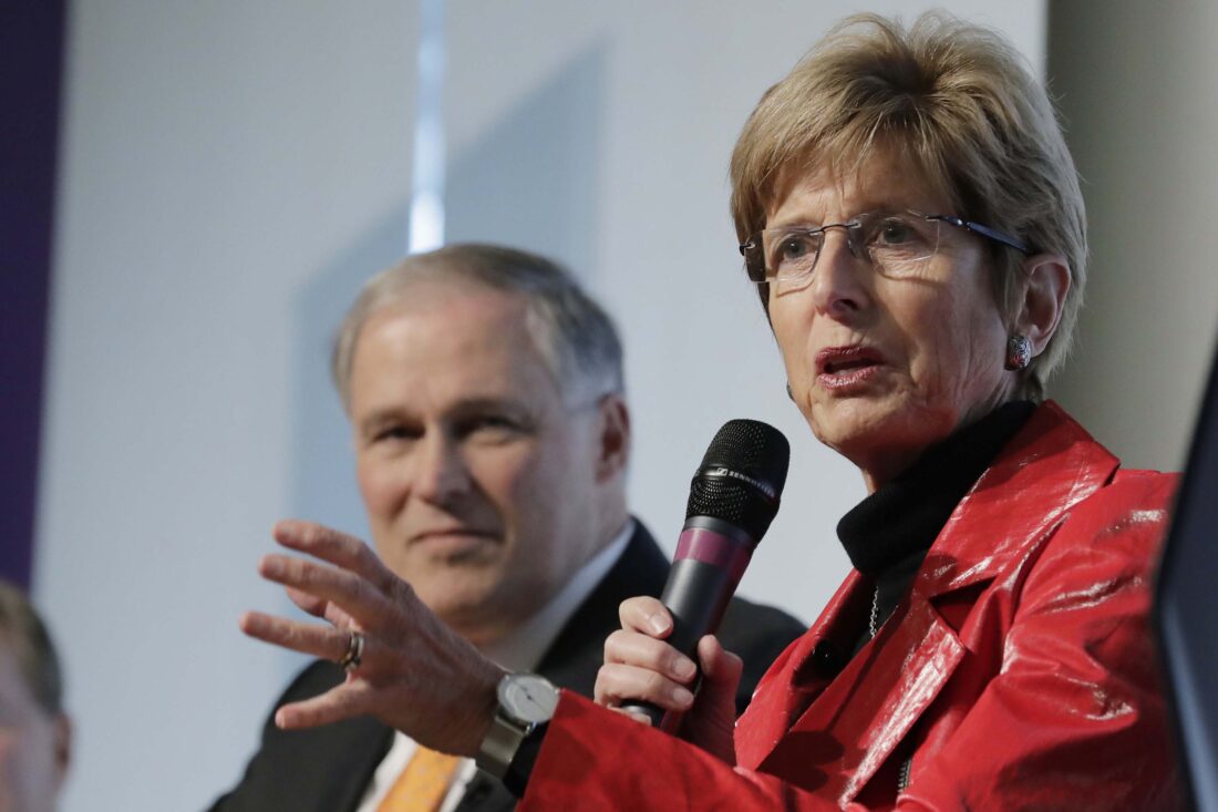 FILE - Christine Todd Whitman, right, the former Republican Governor of New Jersey, speaks, March 6, 2019, in Seattle. Vice President Kamala Harris' campaign is launching "Republicans for Harris" as she tries to win over Republican voters put off by former President Donald Trump's candidacy. Harris' team says the program will aim to use well-known Republicans, including Todd Whitman, to activate their networks, with a particular emphasis on primary voters who backed former U.N. Ambassador Nikki Haley. (AP Photo/Ted S. Warren, File)