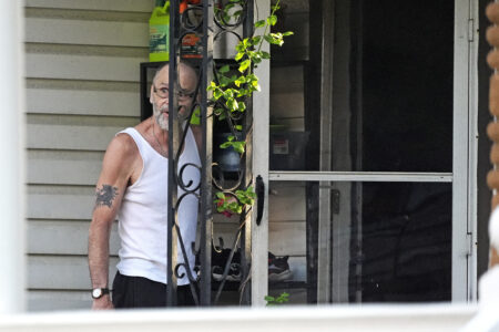Ernie Bevilacqua declines to talk to a reporter after answering his door at his home in Greensburg, Pa., on April 29, 2024. Bevilacqua is among four jailhouse informants whose testimony put Steve Szarewicz behind bars for life on a murder conviction. (AP Photo/Gene J. Puskar)