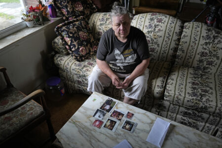 Suzy Patton shows old photos of her brother Steve Szarewicz, who insists he was wrongly convicted of a 1981 murder based on the testimony of four jailhouse informants, on Tuesday, April 30, 2024, in her home in New Kensington, Pa. (AP Photo/Gene J. Puskar)