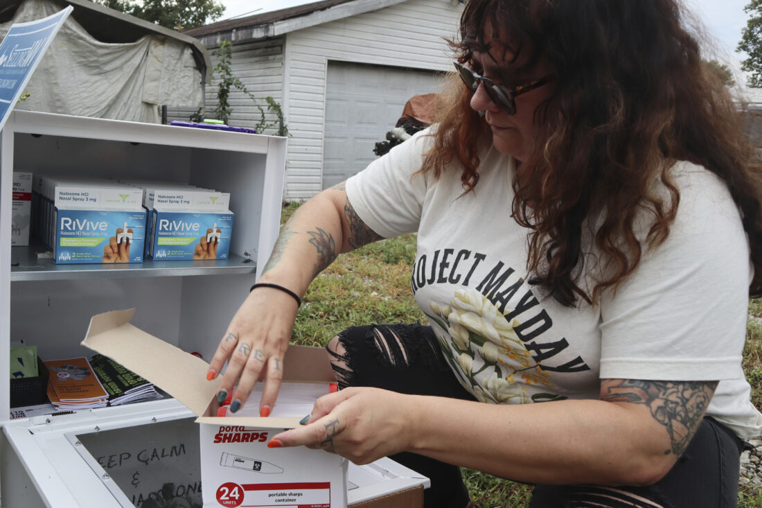Tasha Withrow, a person in recovery and co-founder of harm reduction organization Project Mayday, refills a new naloxone distribution box in a residential neighborhood of Hurricane, W.Va. on Tuesday, Sept. 24, 2024. (AP Photo/Leah Willingham)