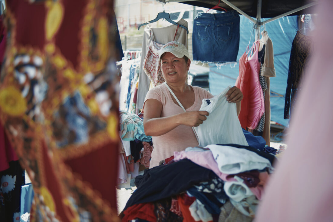 Amber Cardenas, 42, sells clothing at a flea market near Shelby Park in Eagle Pass, Texas, on Friday, Aug. 9, 2024. (Jordan Vonderhaar/The Texas Tribune via AP)