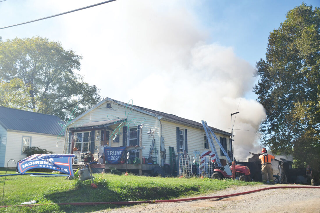 Fire crews were still dealing with hot spots at a fire at 170 Pine Ave. at around 5 p.m. Thursday. The fire broke out around 3:30 p.m. The Mineral Wells Volunteer Fire Department, the East Wood VFD, the Lubeck VFD, the Waverly VFD and the Wood County Fire Investigation team responded to the fire. (Photo by Brett Dunlap)