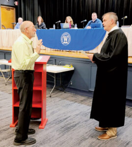 Newly elected Wood County Board of Education member Randy Modesitt was sworn in at Tuesday’s board meeting by Judge Jason Wharton. Modesitt will serve the remaining 20 months of a term left vacant after Debbie Hendershot stepped down in February to run for magistrate. (Photo by Douglass Huxley)