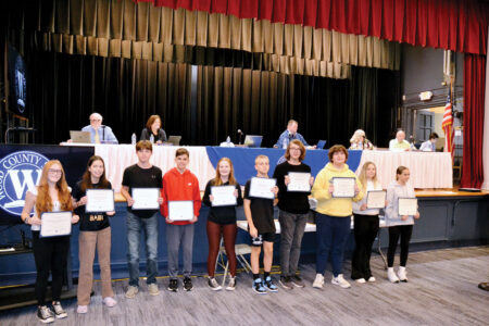 Students from Edison Middle School were recognized Tuesday night by the Wood County Board of Education for their completion of i-Ready lessons. Pictured from left are Aubree Schoenlein, Olivia Pickrell, Ethan Howell, Jackson Holpp, Sydney Groo, Ayden Smith, Owen Davis, Maverick King, Ainslie Koreski and Lillian Phillips. (Photo by Douglass Huxley)