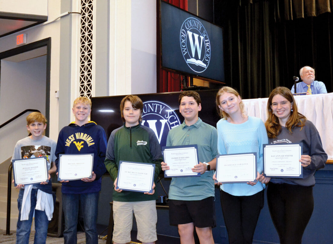 - Students from Jackson Middle School were recognized Tuesday night by the Wood County Board of Education for their completion of i-Ready lessons. Pictured from left are Judah Moore, Brady Miller, Luke McCullough, James D’Eramo, Isabelle Collins and Savannah Smith. (Photo by Douglass Huxley)