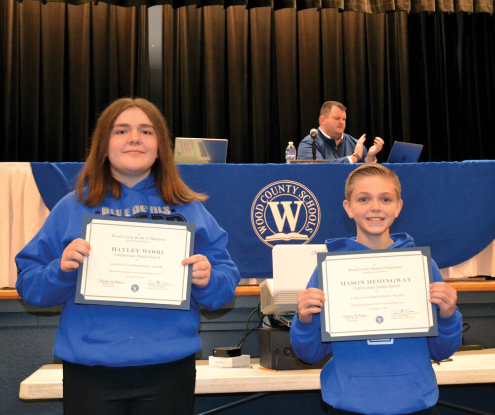 - Van Devender Middle School students Hayley Wood and Mason Hemingway were recognized Tuesday night by the Wood County Board of Education for their completion of i-Ready lessons. (Photo by Douglass Huxley)