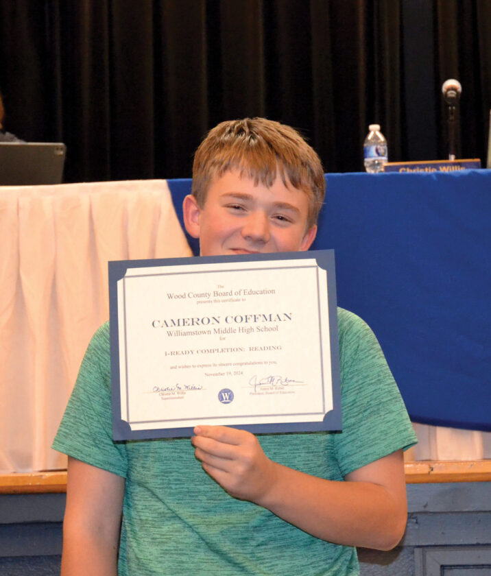 Williamstown Middle/High School student Cameron Coffman was recognized Tuesday night by the Wood County Board of Education for his completion of i-Ready reading. Coffman also completed the math lesson. (Photo by Douglass Huxley)