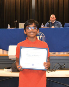 Blennerhassett Middle School student Jayden Mathew was recognized Tuesday night by the Wood County Board of Education for his completion of i-Ready reading. (Photo by Douglass Huxley)