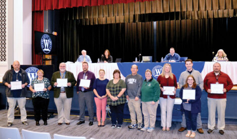 Representatives from middle and high schools in Wood County were recognized Tuesday night by the Wood County Board of Education for their achievements on the West Virginia Balanced Scorecard. Information for the Scorecard can be found at www.mywvschool.org. (Photo by Douglass Huxley)