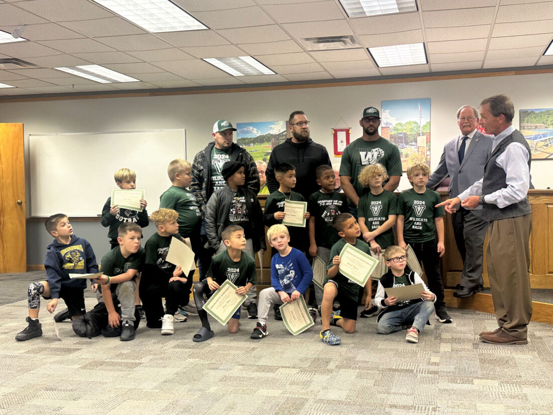 Ohio River Valley Youth Football C Team of the Vienna Wildcat Football Team is honored with certificates for their achievement. Vienna City Councilman Jim Leach tells a story about football players who went on to play both in high school and college who started their careers with the Vienna Wildcat Football team. (Photo by Gwen Sour)
