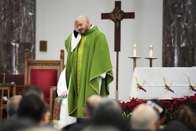 Priest Homero Sanchez reacts as he speaks during a service at St. Rita of Cascia Parish in Chicago, Sunday, Jan. 19, 2025. (AP Photo/Nam Y. Huh)