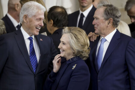 - From left, former President Bill Clinton, former Secretary of State Hillary Clinton, and former President George W. Bush, speak following the 60th Presidential Inauguration for President Donald Trump, in the Rotunda of the U.S. Capitol in Washington, Monday, Jan. 20, 2025. (Shawn Thew/Pool photo via AP)