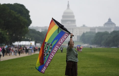 - A demonstrator holds his signs during the World Pride Rally at the Lincoln Memorial, Sunday, June 8, 2025, in Washington. (AP Photo/Jose Luis Magana)