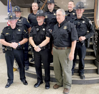 Wood County Sheriff’s Deputy Walker Riddle, center front, stands with Chief Deputy Mike Deem, left, and Sheriff Rick Woodyard as well as other members of the department. Riddle was sworn in Monday. (Photo by Brett Dunlap)