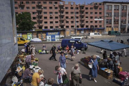 - People shop at a street market near a building which was damaged by a Russian attack in Kyiv, Ukraine, on Thursday, July 10, 2025. (AP Photo/Evgeniy Maloletka)