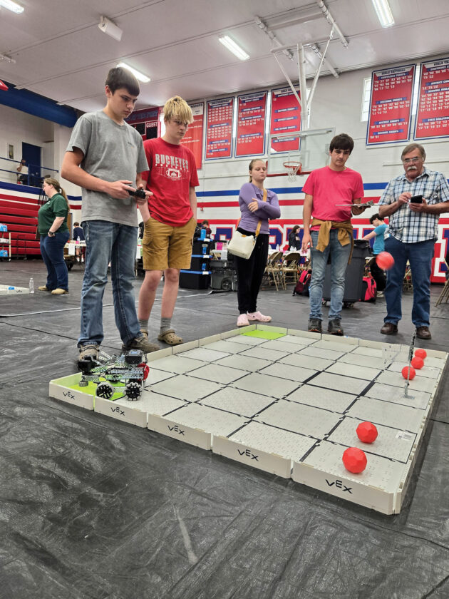 - From left, Fort Frye High School students Colton O’Brien and Zane Campbell make their catapult robot shoot hoops during a May robotics competition at the school. (File Photo)