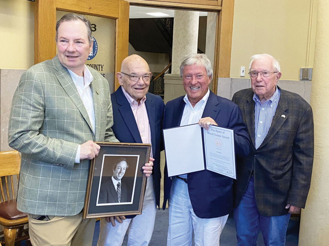 The Wood County Commission honored area businessman Richard Adams on Thursday by awarding him the Spirit of Wood County Award. Pictured are, from left, Commissioner Blair Couch, Commissioner Jimmy Colombo, Adams and Commissioner Robert Tebay. (Photo by Brett Dunlap)