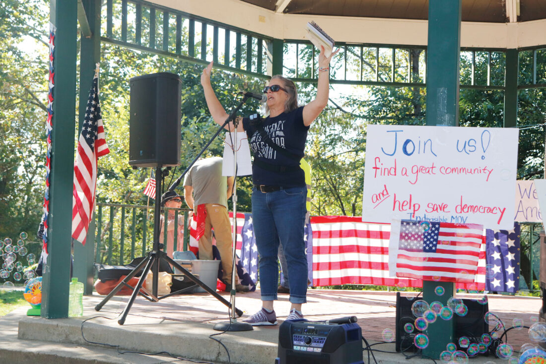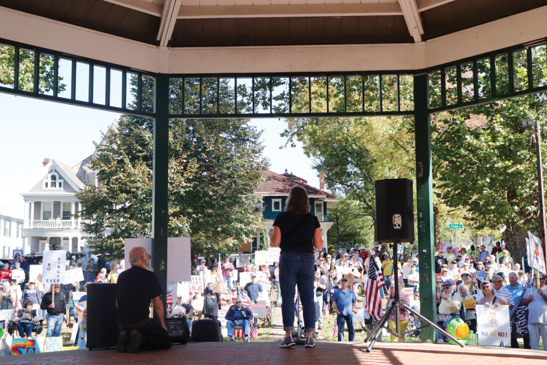- Betsy Cook addresses the crowd at the No Kings Protest and describes Living Democracy, a group she is a part of, which offers various courses, including a recent one on the Constitution. Organizers estimated 1,000 people at the demonstration. (Photo by Gwen Sour)