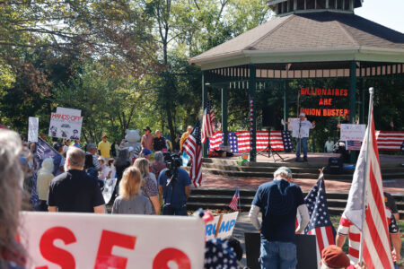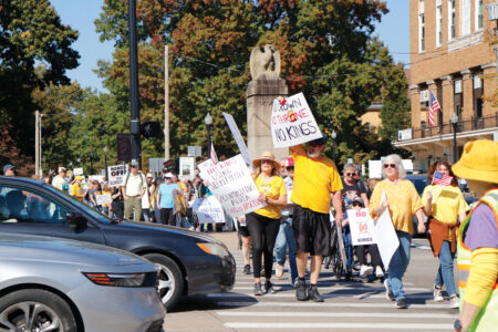 MARIETTA — Demonstrators filled Muskingum Park on Saturday afternoon for the “No Kings” protest, a grassroots rally urging residents to defend democracy, uphold constitutional rights and encourage civic participation ahead of the November election.