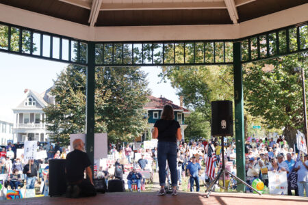 The protest blended speeches with music, including group renditions of This Land Is Your Land led by local musician Sherm Koons, who reminded participants to “blow some bubbles, put on an inflatable costume, and remember that we’re on the right side of history.”
