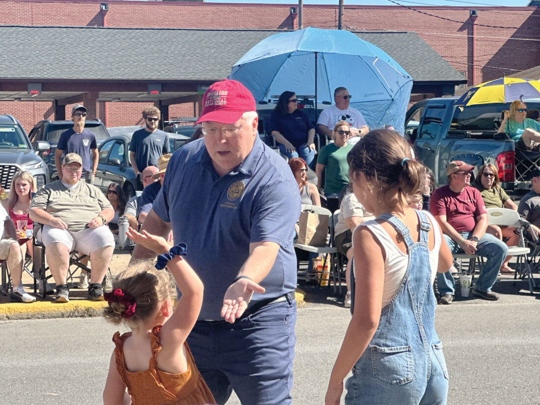 Gov. Patrick Morrisey slapped five with a young spectator as he walked through the Mountain State Forest Festival’s Grand Feature Parade on Saturday in Elkins. (The Inter-Mountain photo by Taylor McKinnie)