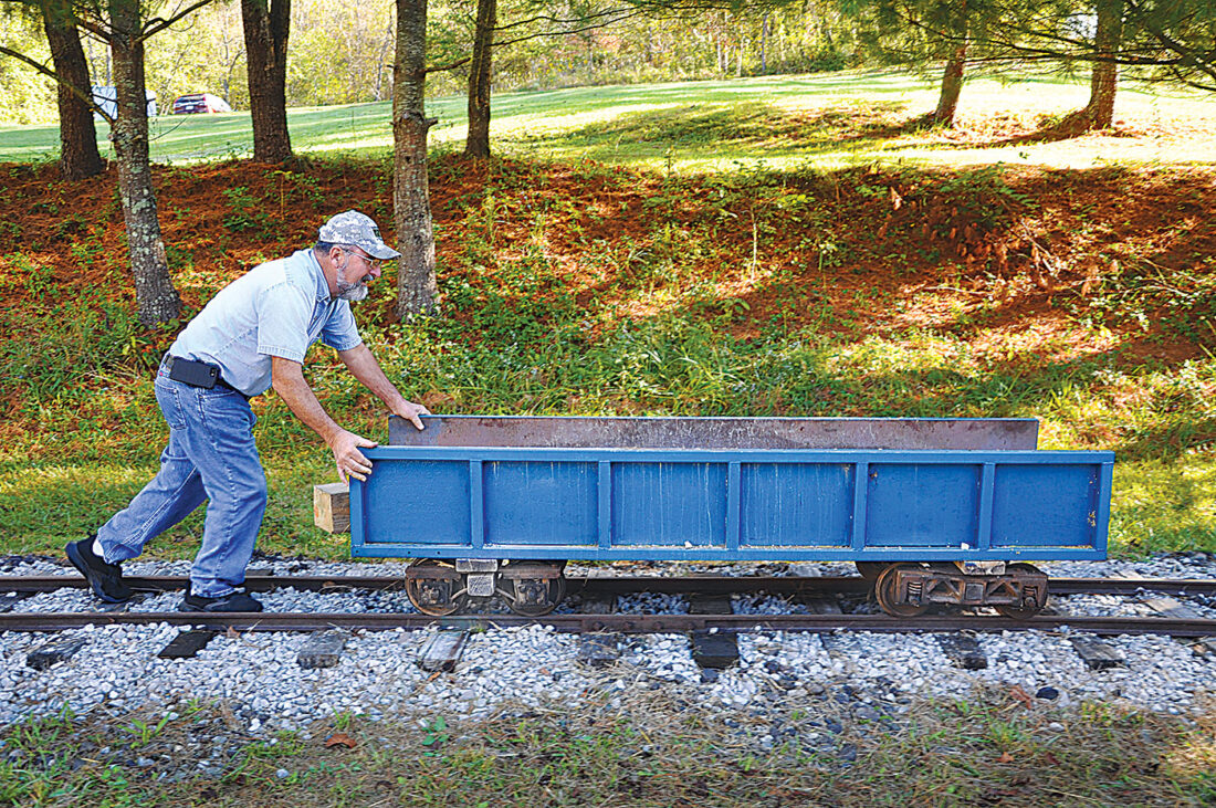 - Chris Arnold pushes a rail car along the track while working to build a train. (Photo by Art Smith)