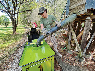 - Jared Arnold shovels coal into the firebox of one of three engines. (Photo by Art Smtih)