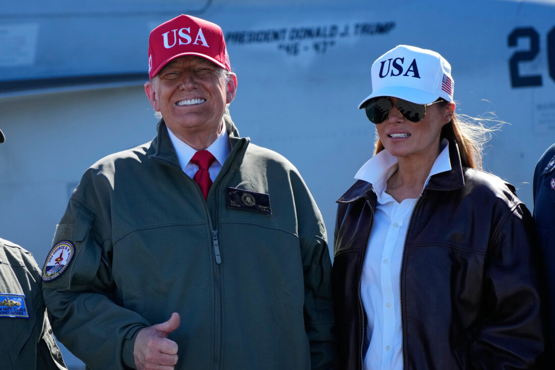 - President Donald Trump and first lady Melania Trump pose in front of a F/A-18E fighter jet with President Donald Trump’s name on it, as part of the Navy’s 250th anniversary celebration, aboard the USS George H.W. Bush aircraft carrier in the Atlantic Ocean off the coast of Norfolk, Va., Sunday, Oct. 5, 2025. (AP Photo/Alex Brandon)