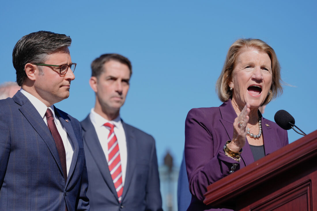 Sen. Shelley Moore Capito, R-W.Va., right, speaks during a news conference to address the shutdown, at the Capitol, Wednesday, Oct. 1, 2025, in Washington. (AP Photo/Mariam Zuhaib)