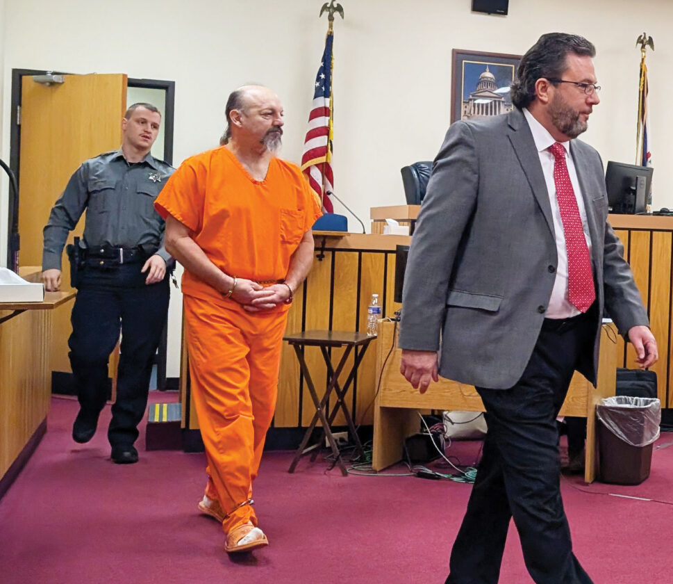 - Gregory A. Casto, center, enters a Wood County Circuit courtroom Monday, following his attorney, Bill Merriman. A motion to set bond for Casto was denied by Judge J.D. Beane. (Photo by Evan Bevins)