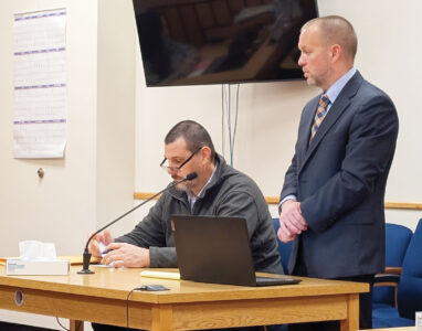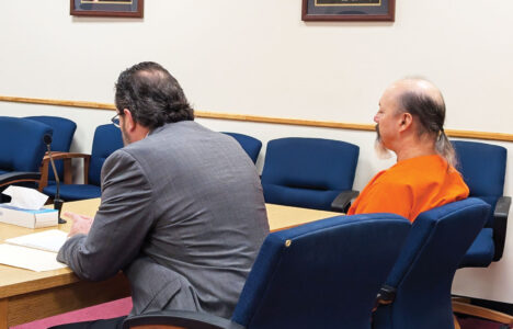 Gregory A. Casto, right, listens during a hearing on a motion to set bond for him on charges of murder and concealment of a deceased human body Monday, alongside attorney Bill Merriman, in Wood County Circuit Court. The motion was denied. (Photo by Evan Bevins)