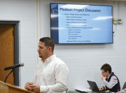 - Sean Cottrill, assistant director of education design, talks to the Wood County Board of Education Tuesday night about improvements coming to Madison Elementary. The school will get a new sprinkler system throughout the building, additions that will accommodate an additional 150 students and additional entrance and exit points to help relieve vehicle congestion. (Photo by Douglass Huxley)