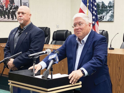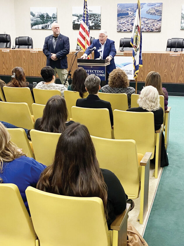 Gov. Patrick Morrisey, with Delegate Dave Foggin, R-Wood, appeared in Parkersburg City Council chambers Thursday to announce $16.3 million in West Virginia Victims of Crime Act (VOCA) grants for projects across the state including a grant for the Wood County Commission to pay for the Victim Advocates in the Wood County Prosecutor’s Office and a grant to the Family Crisis Intervention Center of Region V in Parkersburg to be used to provide direct service advocates services to victims and survivors of domestic violence, sexual violence, stalking, and human trafficking. (Photo by Brett Dunlap)