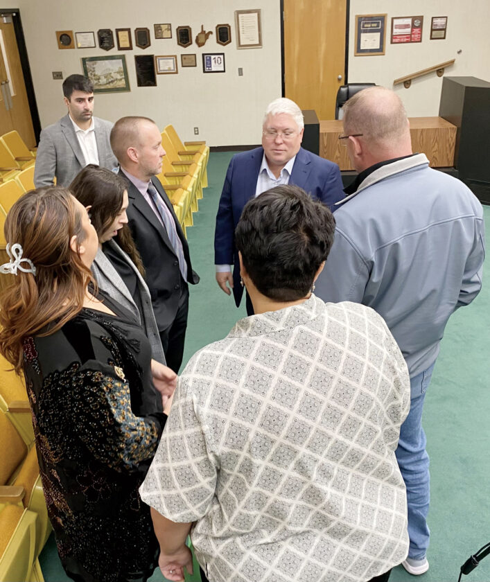Gov. Patrick Morrisey speaks with Wood County Prosecutor Pat Lefebure as well as representatives from the Family Crisis Intervention Center of Region V in Parkersburg and others on Thursday in Parkersburg City Council chambers where the governor announced $16.3 million in West Virginia Victims of Crime Act (VOCA) grants to 83 projects across the state. (Photo by Brett Dunlap)