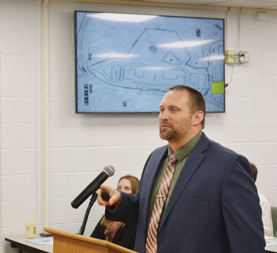 - Kaleb Lawrence, assistant superintendent of operations, talks to the Wood County Board of Education Tuesday night about the district’s ongoing bond projects. Lawrence also spoke to the board about creating a new Director of Safety and Security position. (Photo by Douglass Huxley)