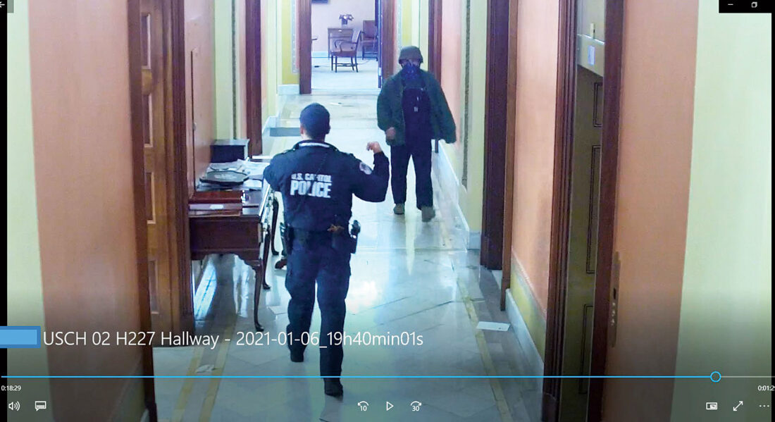 A U.S. Capitol Police officer, left, directs Eric Barber out of the House Speaker’s suite of offices on Jan. 6, 2021, in this still image from closed-circuit video included in the defense’s sentencing memorandum in Barber’s misdemeanor case. Barber was among those pardoned by President Donald Trump earlier this year, and he is now seeking compensation for his prosecution. (Photo Provided)