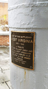 - A plaque affixed to the mast of the USS West Virginia. (Photo by Ron Rittenhouse/The Dominion Post)